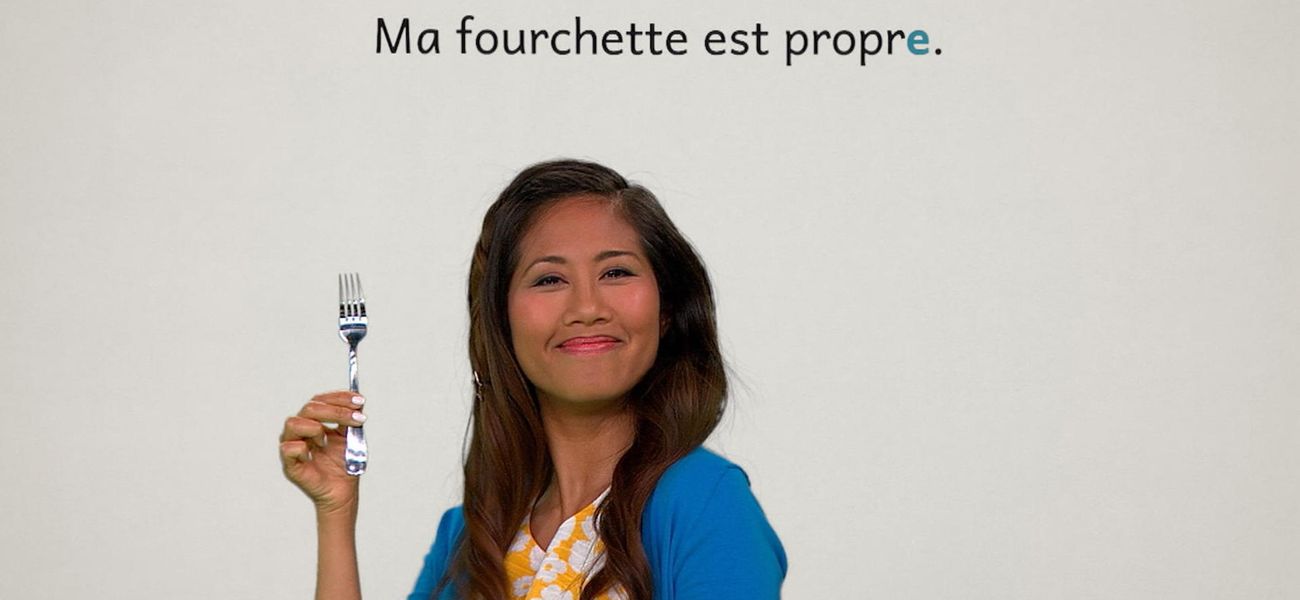 L'adjectif présenté dans cet épisode est : *propre*. Le couteau de Christopher est propre. Eh, la fourchette d'Alice est propre aussi. Les deux sont propres avec un S. Oh, les amis réalisent que ça ne s'accorde pas de la même manière. L'adjectif « propre » prend la marque du pluriel, mais reste le même au singulier!