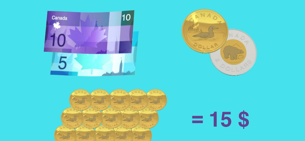 Découvre comment obtenir 15 dollars avec des pièces de 1 dollar et de 2 dollars. Wow! Il y a plusieurs combinaisons possibles. En connais-tu d'autres?