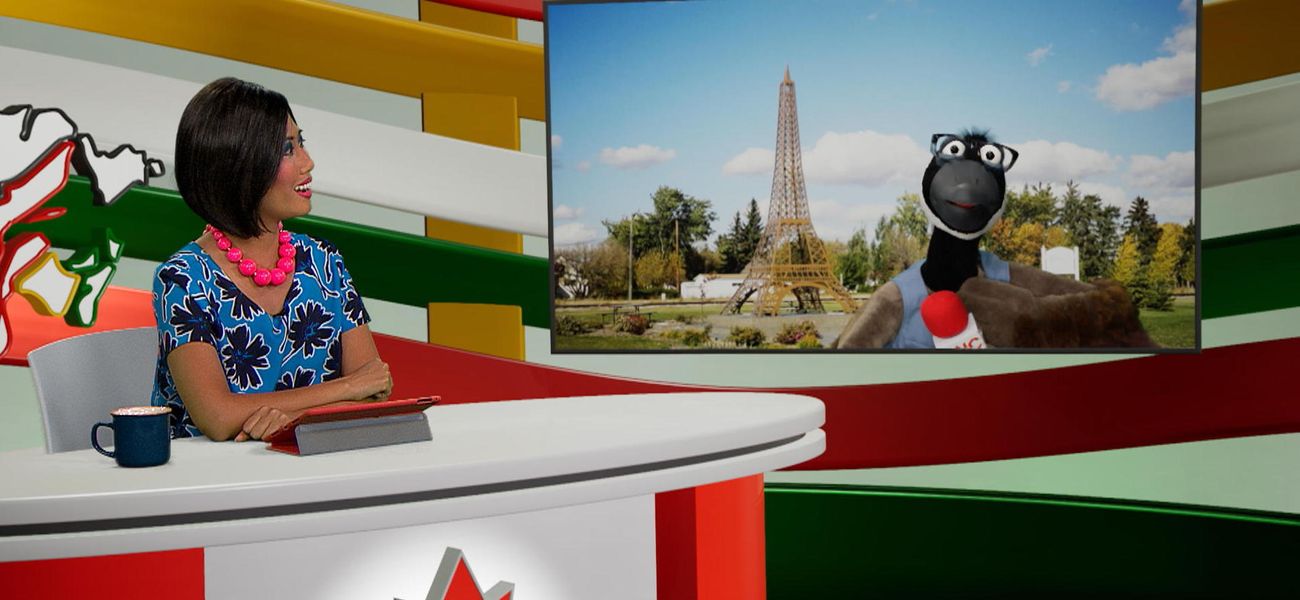 Aujourd'hui, la chef d'antenne Alice et son journaliste de terrain la marionnette Jean-Christopher Bernache nous présentent la tour Eiffel du Canada. Cette réplique de la tour Eiffel française se trouve dans la ville de Montmartre en Saskatchewan.