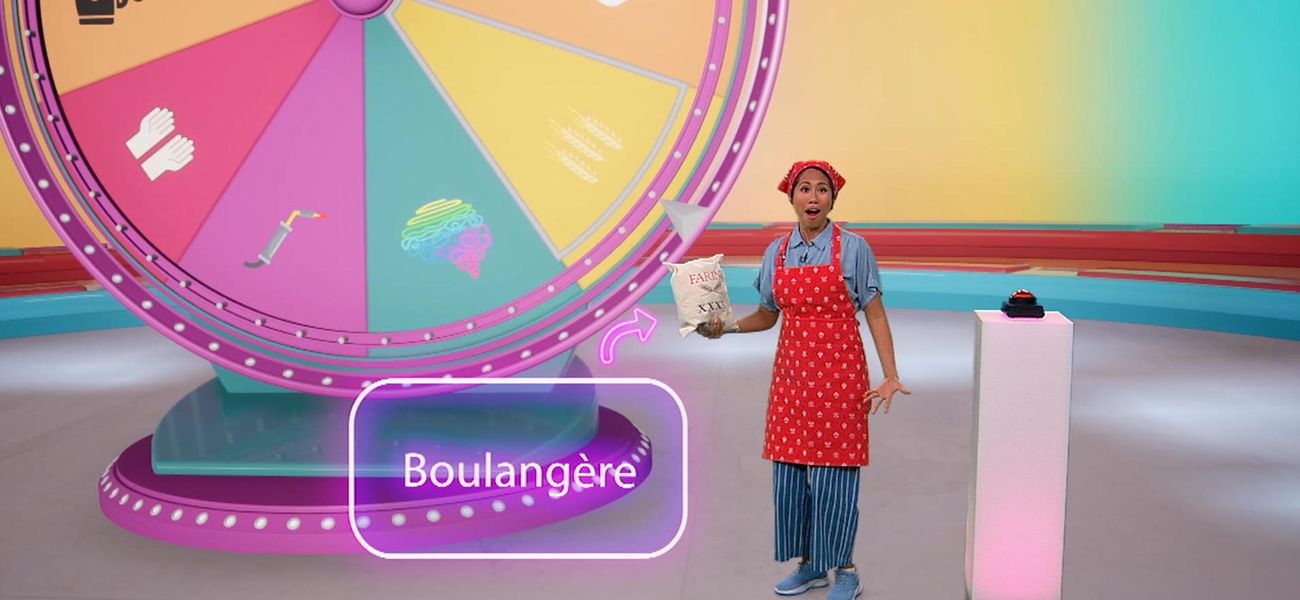 Alice tourne la roue du jeu et le métier du jour lui est dévoilé… boulangère! Waouh, elle découvre plein de choses sur ce métier excitant : en quoi il consiste, quelles sont les études à faire, etc.