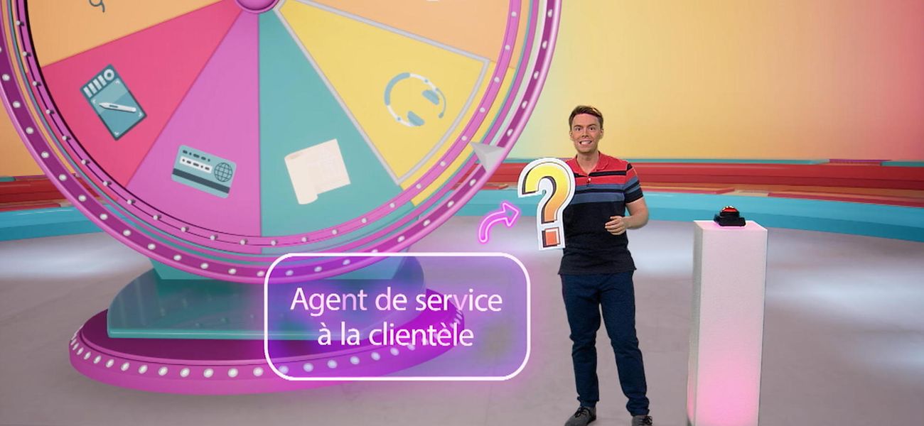 C’est au tour de Christopher de tourner la roue pour découvrir le métier du jour… agent de service à la clientèle! Il apprend plein de choses sur ce métier passionnant.