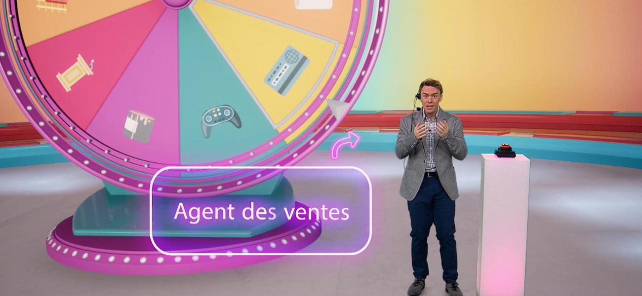 Christopher tourne la roue du jeu et le métier du jour lui est dévoilé... agent des ventes! Waouh, il découvre plein de choses sur ce métier passionnant : en quoi il consiste, quelles sont les études à faire, etc.