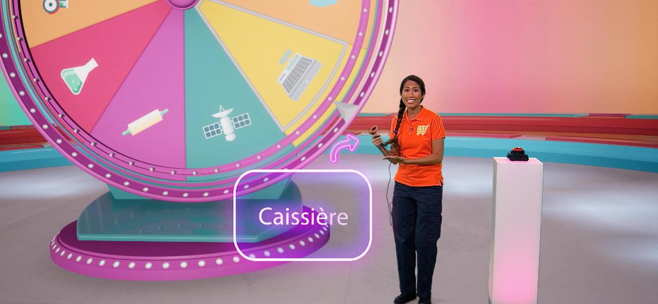 La joueuse Alice tourne la roue du jeu et le métier du jour lui est dévoilé… caissière! Elle apprend plein de choses sur ce métier.