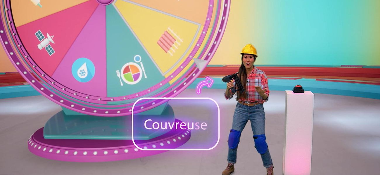 La joueuse Alice tourne la roue du jeu et le métier du jour lui est dévoilé… couvreuse! Waouh, elle découvre plein de choses sur ce métier passionnant : en quoi il consiste, quelles sont les études à faire, etc.