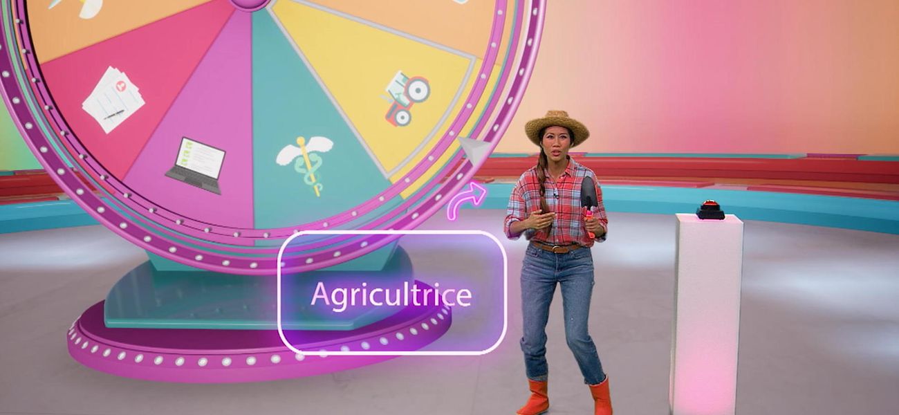 C’est au tour d’Alice de tourner la roue du jeu pour dévoiler le métier d’agricultrice! Elle apprend plein de choses sur ce métier.