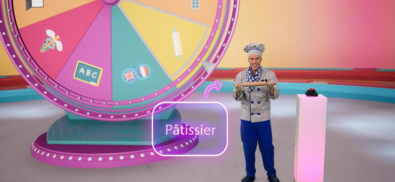 Le joueur Christopher tourne la roue du jeu et le métier du jour lui est dévoilé… pâtissier! Waouh, il découvre plein de choses sur ce métier passionnant : en quoi il consiste, quelles sont les études à faire, etc.