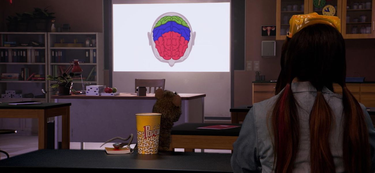 Le rat Bestiole apprend à sa meilleure amie, la zombie Morgane, le rôle du lobe occipital du cerveau dans le corps humain. Waouh, Morgane trouve que c'est fascinant... et appétissant, ha ha!