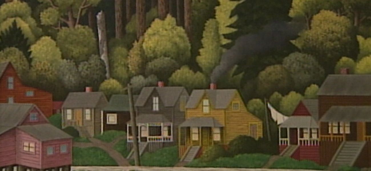 Les enfants décrivent l'œuvre Maisons indiennes à Alert Bay de E. J. Hughes, datant de 1951.