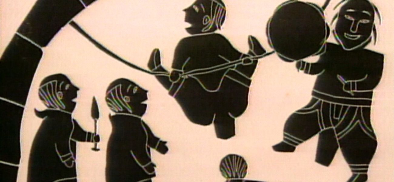 Les enfants analysent l'œuvre Jeu dans un igloo de Helen Kalvak, datant de 1966.