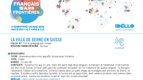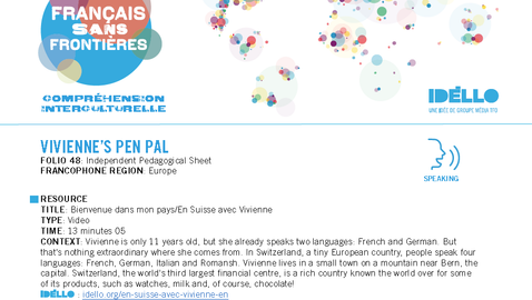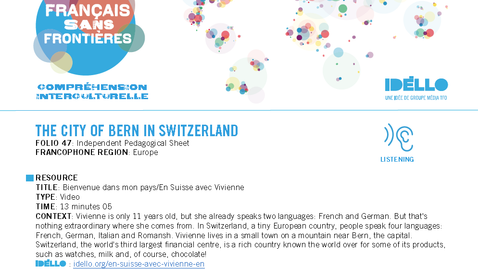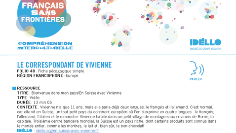 Vivienne n'a que 11 ans mais elle parle déjà deux langues, le français et l'allemand. C'est normal car elle vit en Suisse, un tout petit pays du continent européen où l'on s'exprime en quatre langues : le français, l'allemand, l'italien et le romanche. Vivienne habite dans un petit village de montagne aux environs de Berne, la capitale. Elle profite donc du charme des hauteurs où des milliers de touristes viennent skier chaque année, mais aussi de la proximité de la capitale. Troisième centre bancaire mondial, la Suisse est un pays riche, dont certains produits sont connus dans le monde entier comme les montres, le lait et, bien sûr, le bon chocolat!