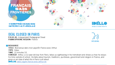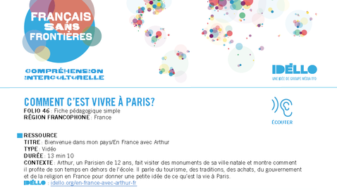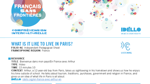 Arthur, 12 ans, habite à Paris, la capitale de la France. Grand pays situé à l'ouest du continent européen, la France est un hexagone entouré par la mer à l'ouest, au nord et au sud. Pays le plus visité au monde, la France ne s'enrichit pas uniquement grâce à l'industrie touristique. C'est aussi un état très industrialisé connu dans le monde entier pour ses trains à grande vitesse, ses avions et ses fusées! Mais la France est aussi l'héritière d'un riche passé. Arthur nous emmène donc visiter le magnifique château de Breteuil pour nous le prouver!