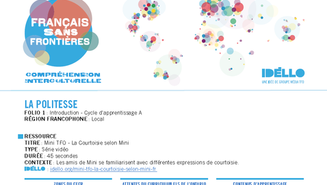 "For teachers of French as a second language, this Learning Cycle A accompanies the series 'Mini TFO - La courtoisie selon Mini'. FSL curriculum expectations: A3, B3 – Intercultural Understanding."