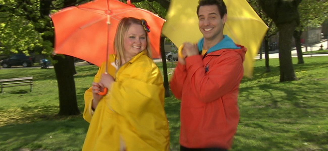 Josée and Louis introduce us to the changes that occur in spring and the celebrations and activities that can be experienced at this time of year. Here, they have fun jumping in puddles.