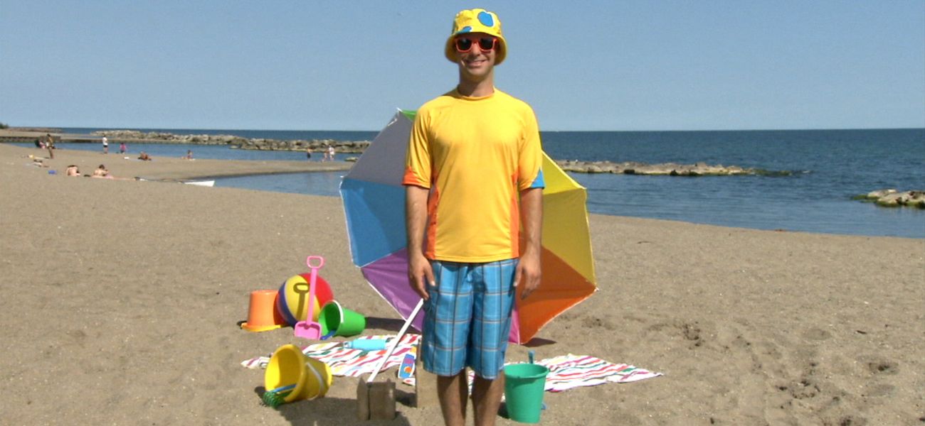 Louis et Josée explorent le sens de l'espace. Ils sont à côté du parasol. Objectif : Permettre à l'enfant de reconnaître la position d'un objet dans l'espace.