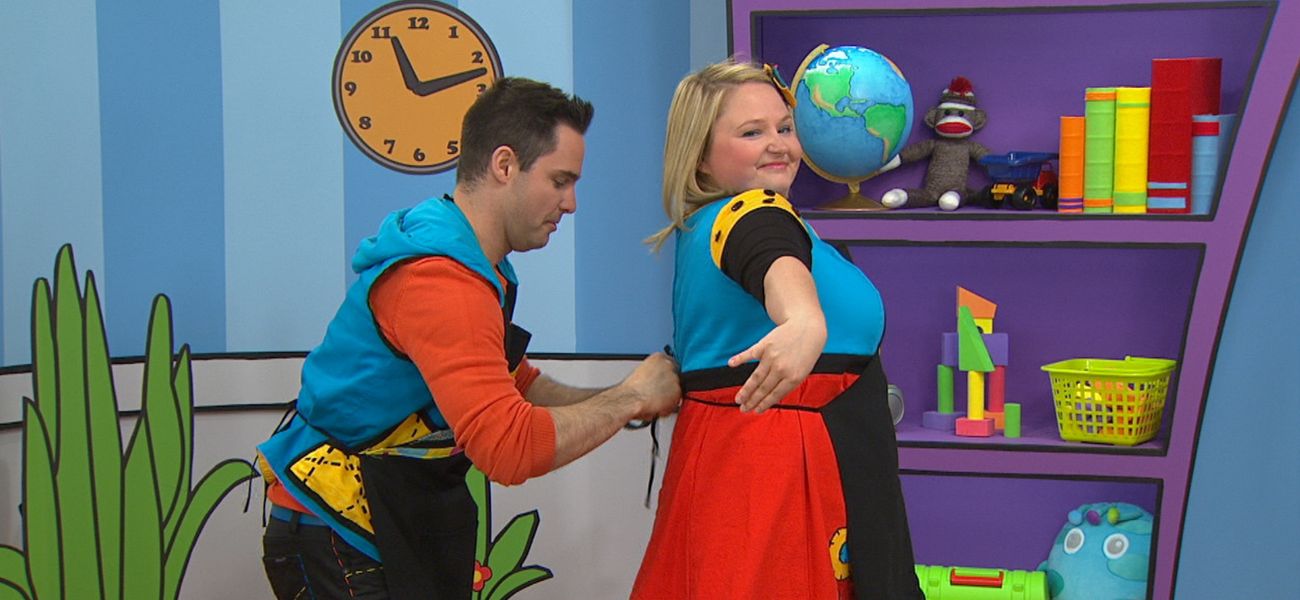 Josée and Louis collaborate in various circumstances. Josée and Louis help each other tie their aprons.