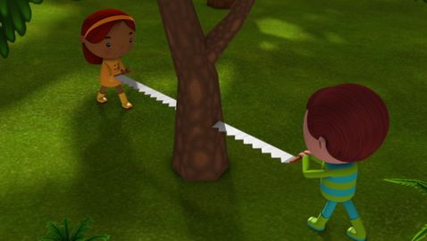 Mini TFO's friends have fun cutting wood to build toys!