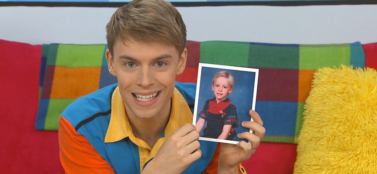 The hosts take turns showing pictures of themselves as children and talking about what they liked to do. Christopher shows a picture of himself in his 'little boat' sweater.
