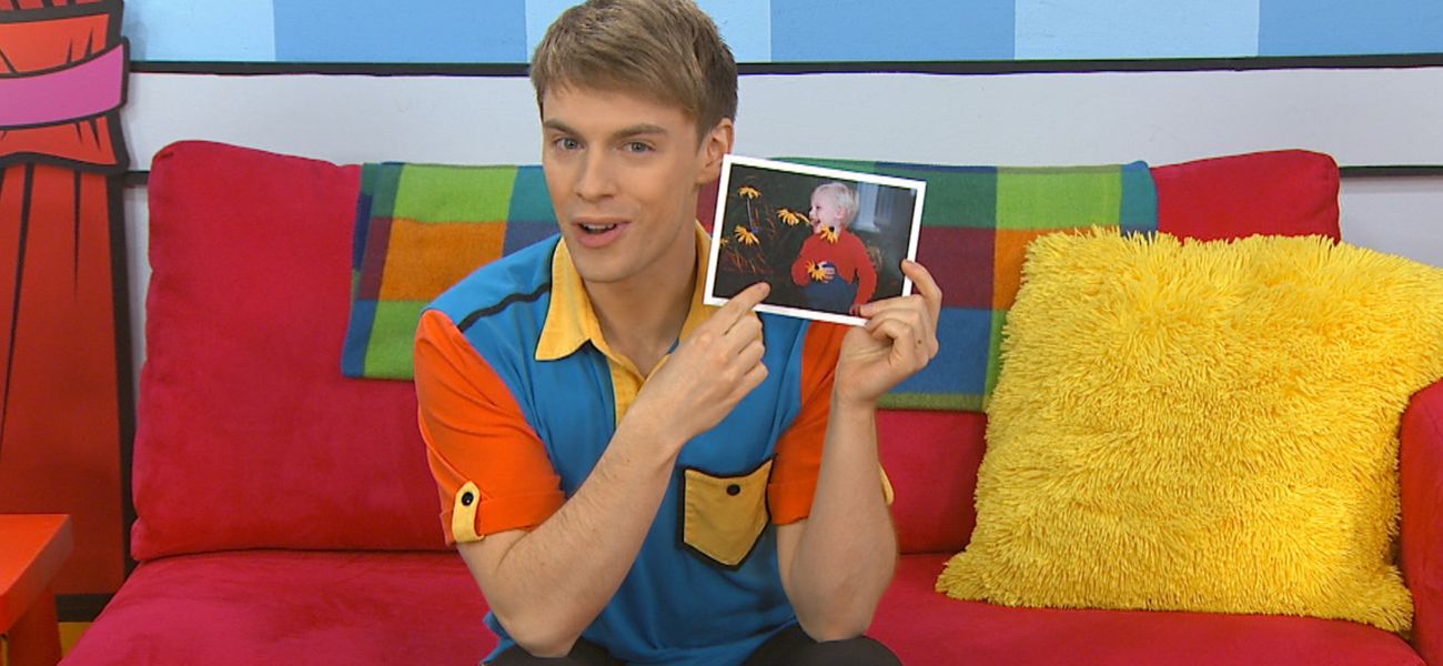 The hosts take turns showing pictures of them as children and talking about what they liked to do. Christopher shows a picture of himself wearing the same sweater.