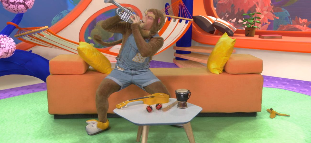 Lexie shows the child the sound made by a ukulele, a trumpet and a flute. She goes off to the kitchen, and when she returns... the minitrompette has disappeared! How can this be? The clues are clear: Bisbille has been there. Quick, we've got to catch him!