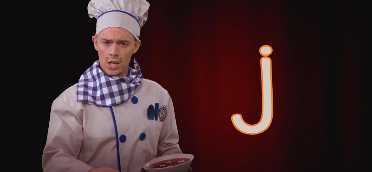 A ... B ... C ... Chef Alphabet loves opera and the letters of the alphabet! No wonder that on stage, he enjoys singing the alphabet, encouraged by his loyal audience, alphabet noodles, ha ha! Learn to pronounce the letter j with Chef Alphabet.
