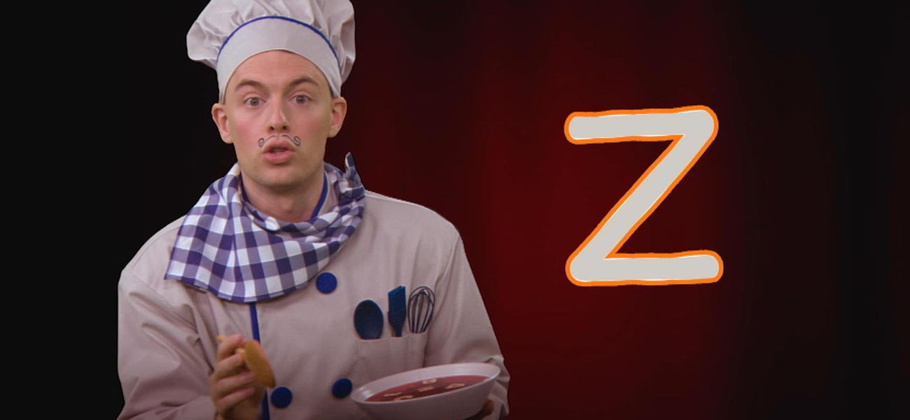A ... B ... C ... Chef Alphabet loves opera and the letters of the alphabet! No wonder that on stage, he enjoys singing the alphabet, encouraged by his loyal audience, alphabet noodles, ha ha! Learn to pronounce the letter z with Chef Alphabet.