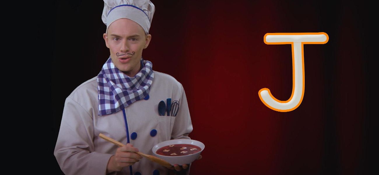 A ... B ... C ... Chef Alphabet loves opera and the letters of the alphabet! No wonder that on stage, he enjoys singing the alphabet, encouraged by his loyal audience, alphabet noodles, ha ha! Learn to write uppercase letter J with Chef Alphabet.