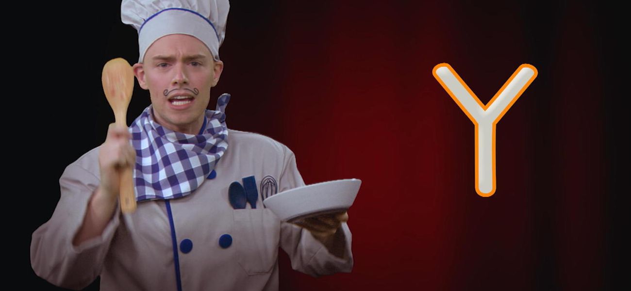 A ... B ... C ... Chef Alphabet loves opera and the letters of the alphabet! No wonder that on stage, he enjoys singing the alphabet, encouraged by his loyal audience, alphabet noodles, ha ha! Learn to write uppercase letter Y with Chef Alphabet.