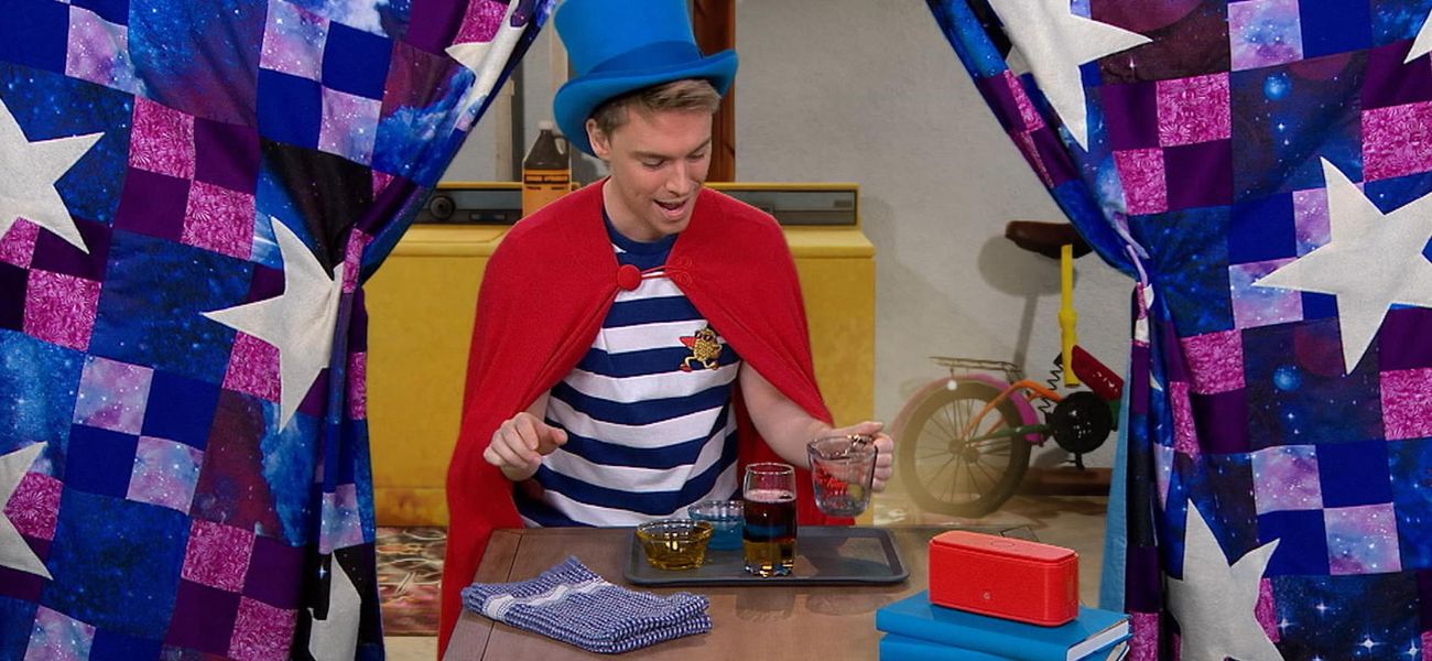 Christopher tries to fit a rainbow into a bottle and abracadabra... He discovers that it's science, because liquids don't have the same weight, that's why they pile up on top of each other.