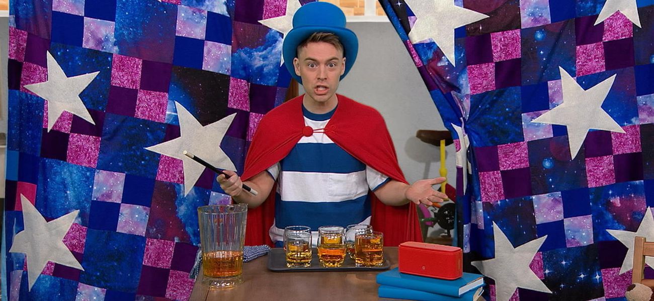 Christopher makes different sounds with pots and abracadabra... He discovers that it's science, because the pots don't contain the same amount of water and this creates different sounds.