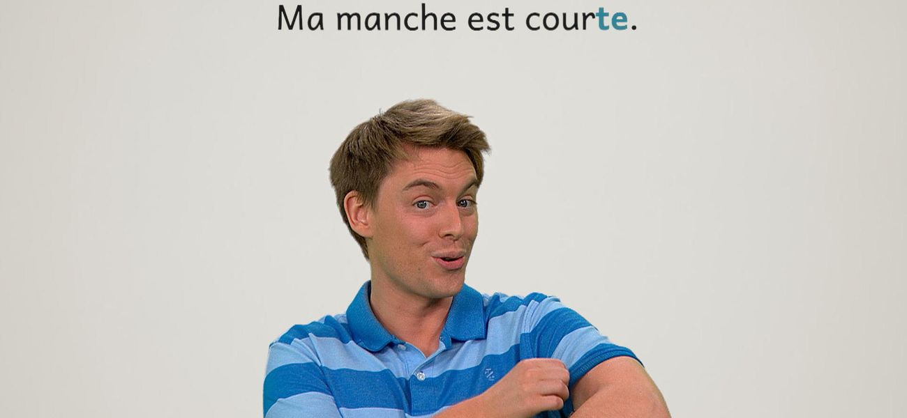 The featured adjective in this episode is: *court* Alice's pencil is short. Christopher's sleeve is short. They realize that in French, the adjective 'court' is different in the masculine, in the feminine and plural form. One thing is for sure, they are both short.