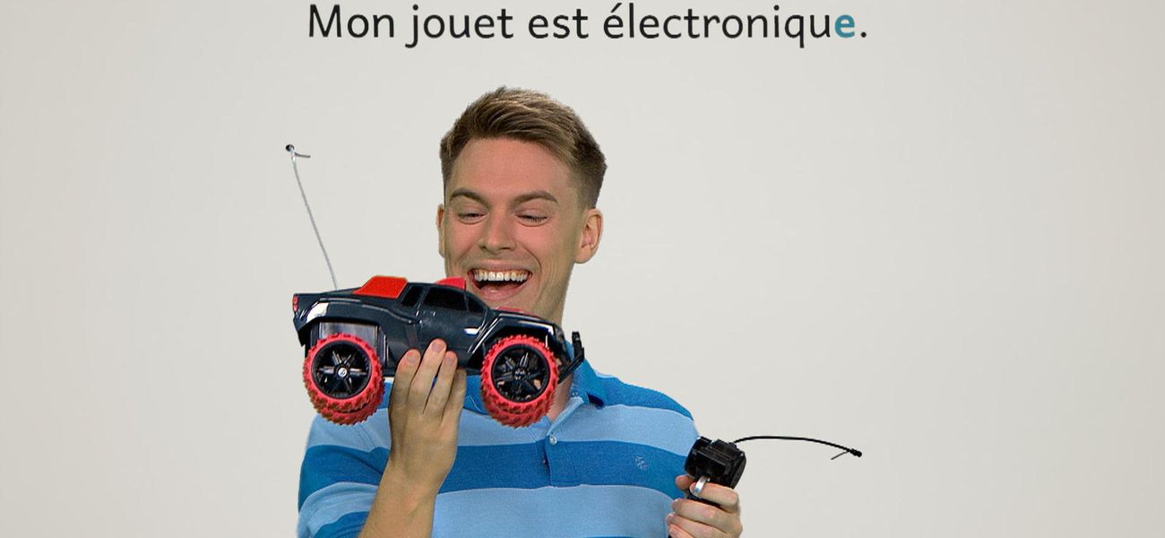 The featured adjective in this episode is: *électronique*. Alice has an electronic toy and Christopher holds an electronic tablet. Their items are electronic with an S. They realize that the adjective 'électronique' takes the plural mark, but remains the same in the singular!