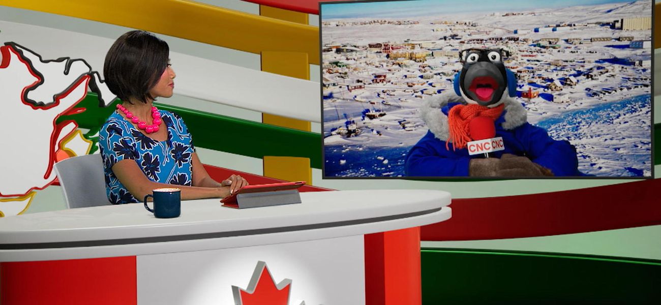 Today, news anchor Alice and her field reporter, puppet Jean-Christopher Bernache, introduce us to the major cities of Nunavut. Can you guess which are the largest cities in the territory?