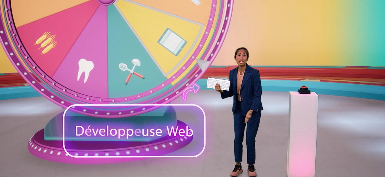 The player Alice turns the wheel of the game and the job of the day is revealed to her... Web developer! Wow, she discovers a lot of things about this fascinating job: what it consists of, what are the studies to do, etc.