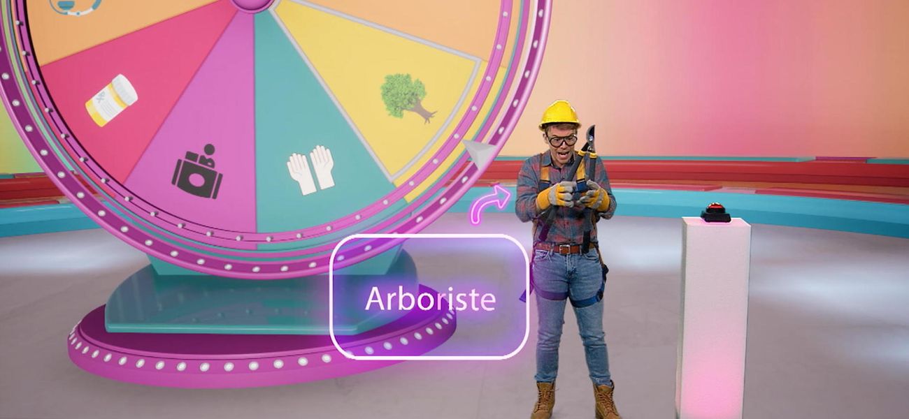 Christopher turns the wheel of the game and the job of the day is revealed to him... arborist! Wow, he discovers a lot of things about this fascinating job: what it consists of, what are the studies to do, etc.