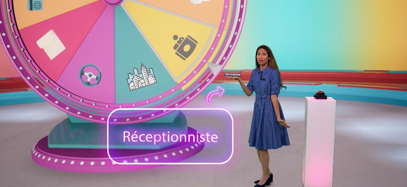 The player Alice turns the wheel of the game and the job of the day is revealed to her... receptionist! Wow, she discovers a lot of things about this fascinating job: what it consists of, what are the studies to do, etc.