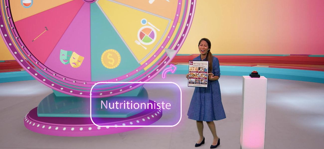 The player Alice turns the wheel of the game and the job of the day is revealed to her... nutritionist! Wow, she discovers a lot of things about this fascinating job: what it consists of, what studies you have to do, etc.