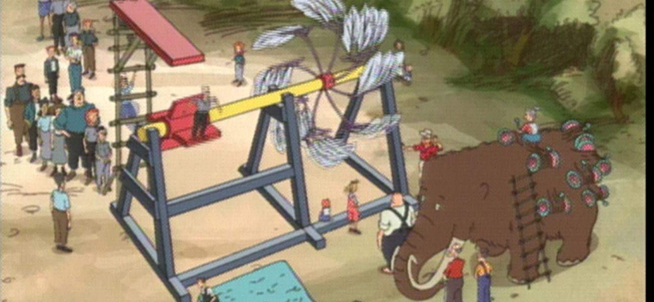 Because of the summer heat, the mammoths give off a stench. To remedy this, the islanders try to wash them. Based on the principles of wheels and axles, Franck, Barnabé and Olive make several attempts to build machines to dry the mammoths.