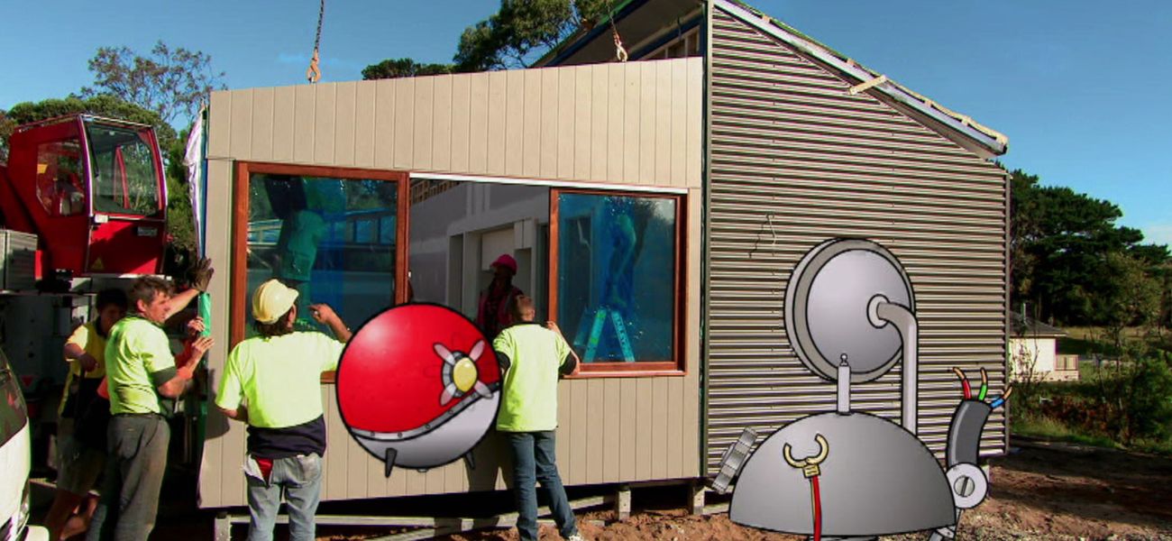 Pat can't believe what he sees when an actual prefabricated house, built entirely inside a factory, is transported to his new address.