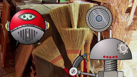 Pat and Bibi discover how to tie straw securely to a broom handle so that it doesn't fly away.