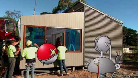 Pat can't believe what he sees when an actual prefabricated house, built entirely inside a factory, is transported to his new address.