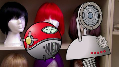 Our two characters discover how to make wigs from real hair.