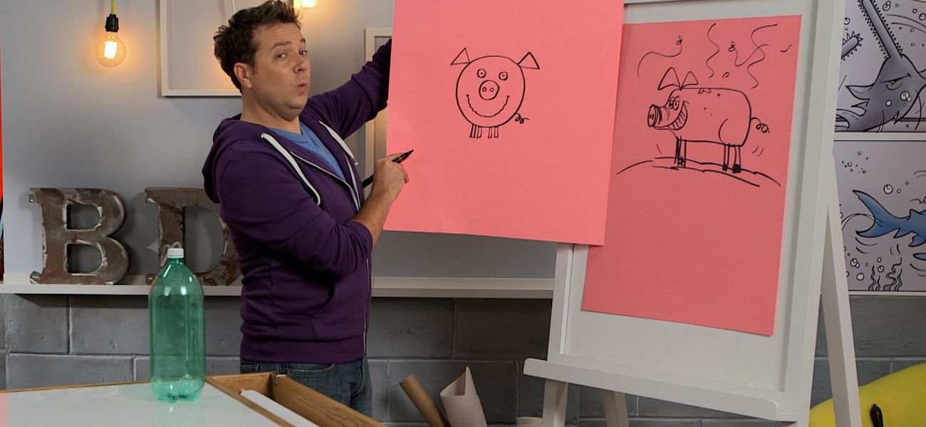 How to draw a pig? Tristan uses the shape of a plastic bottle, seen from the front, and geometric shapes to draw a pig.