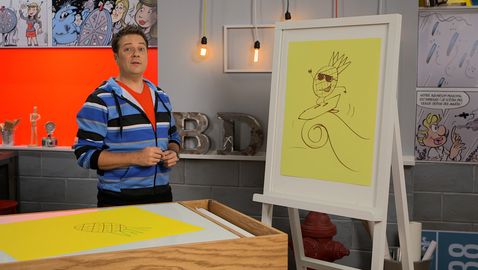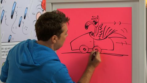 How to draw a sail board? Tristan uses the shapes of a wave and a sun to draw a parasol and a sailboat.