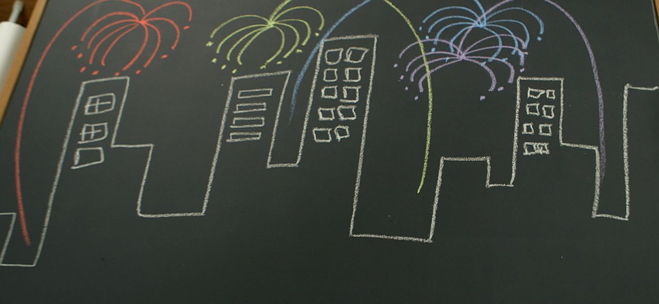 Tristan uses geometric shapes to draw fireworks that explode over a city.