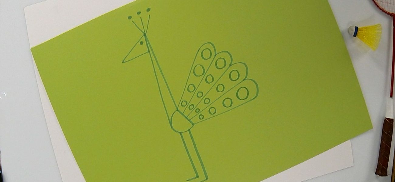 Tristan uses the shape of a badminton ball to draw a peacock.