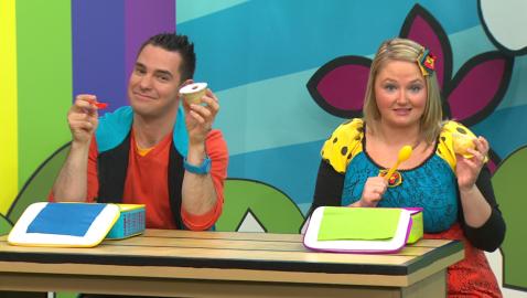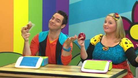 Louis et Josée découvrent des collations santé. Ils découvrent une banane et des raisins secs dans leurs boîtes à goûter.