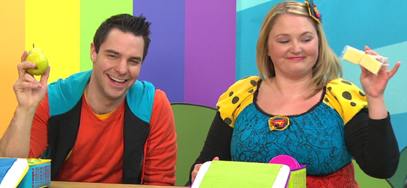 Louis et Josée découvrent des collations santé. Ils découvrent des morceaux de fromage et une poire dans leurs boîtes à goûter.