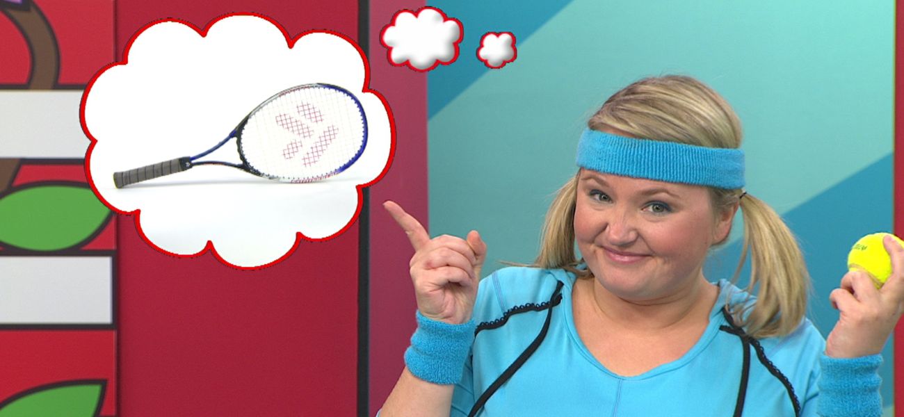 Louis and Josée are doing activities, but something is missing. Josée is getting ready to play tennis. What is she missing?