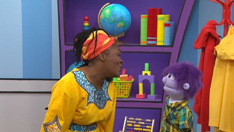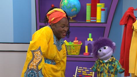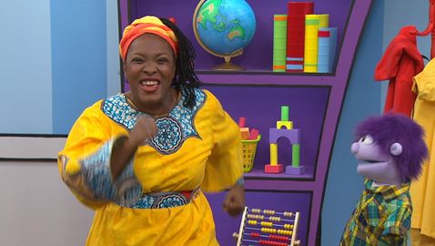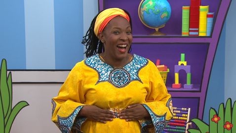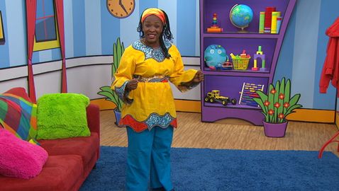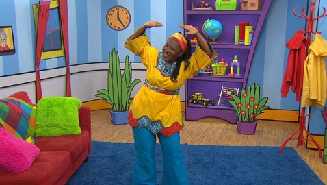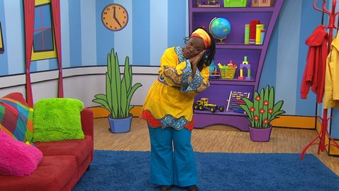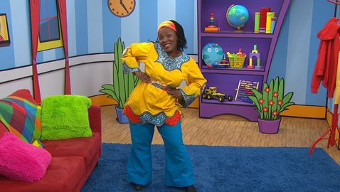 Madame Bonheur danse et chante des comptines à l'enfant. Elle fait des mouvements sur la comptine «Violette à bicyclette» avec Charlie et les amis.