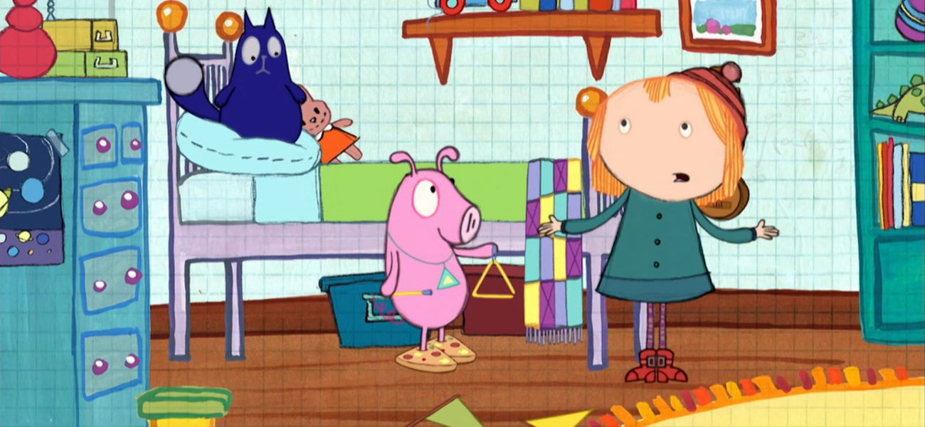 Cat and Peg have to clean up the mess in Peg's room. They sort the mess by grouping the items according to their shapes but Pig does not want to help and only has fun wearing triangles.
